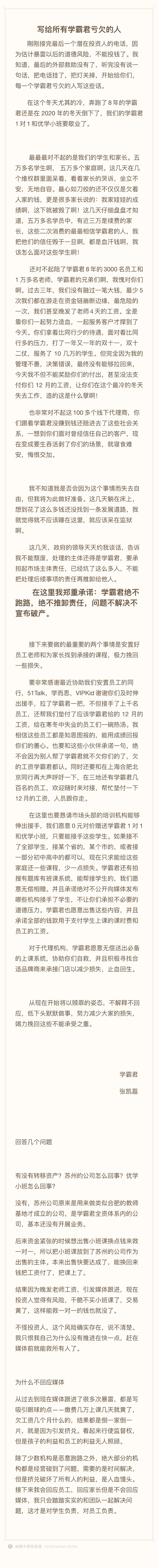 不過,張凱磊在信中承諾:“學(xué)霸君絕不跑路,絕不推卸責(zé)任,問題不解決不宣布破產(chǎn)。”