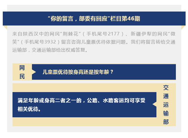 2021-02-03 00:15:08閱讀()交通運(yùn)輸部【交通運(yùn)輸部:滿足年齡或身高二者之一可享兒童票】“兒童票優(yōu)待按身高還是按年齡”?交通運(yùn)輸部回應(yīng):根據(jù)規(guī)定,對符合條件的兒童提供免費(fèi)乘坐客運(yùn)班車(國內(nèi)水路客運(yùn)船舶)或者客票半價(jià)優(yōu)待(9座及以下客車除外),免票兒童的范圍為6周歲(含)以下或者身高1.2米(含)以下;客票半價(jià)優(yōu)待兒童的范圍為6—14周歲或者身高1.2—1.5米。滿足年齡或身高二者之一的,均可享受相關(guān)優(yōu)待。