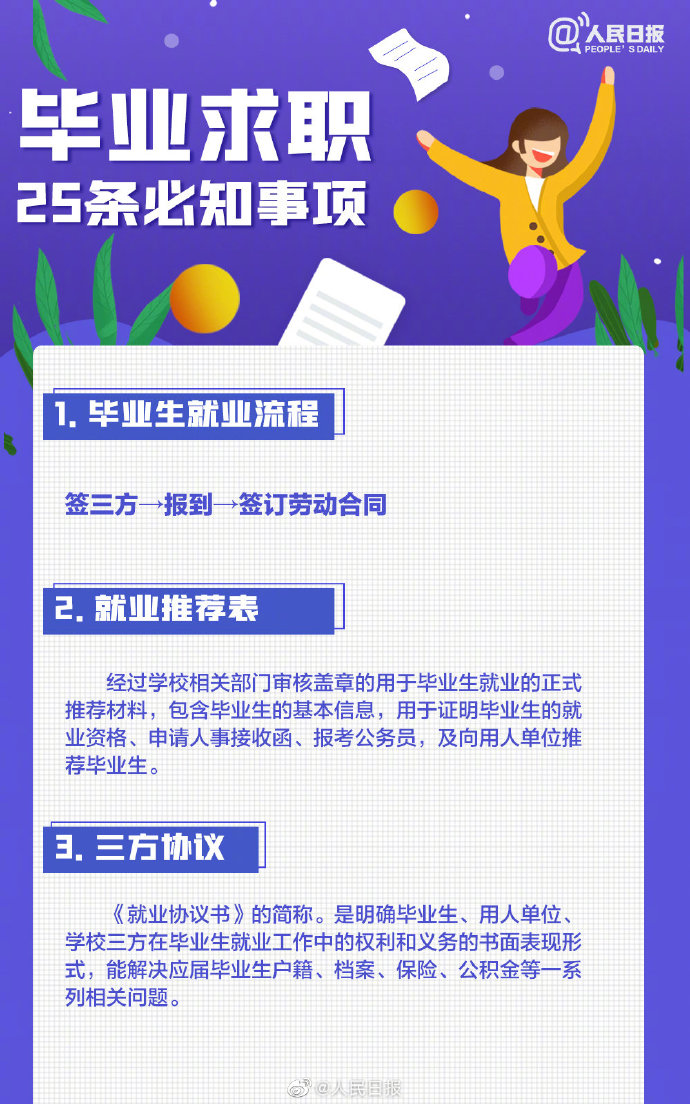 2021-05-13 09:41:26閱讀()人民日?qǐng)?bào)離2021年畢業(yè)季已不到50天,今年高校畢業(yè)生總規(guī)模預(yù)計(jì)909萬人。即將畢業(yè)的你是否還在忙著投簡歷、找工作?派遣、二分、檔案、試用期……這些詞,你都搞清楚了嗎?簽勞動(dòng)合同要關(guān)注哪些要點(diǎn)?求職前,這些事你應(yīng)該了解↓↓轉(zhuǎn)給即將離校的你,祝一切順利,畢業(yè)快樂! ????