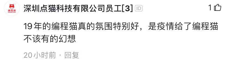 部分編程貓的員工表示,公司的氛圍到了2020年就變了,2019年之前都不錯(cuò),”是疫情給了編程貓不該有的幻想“。