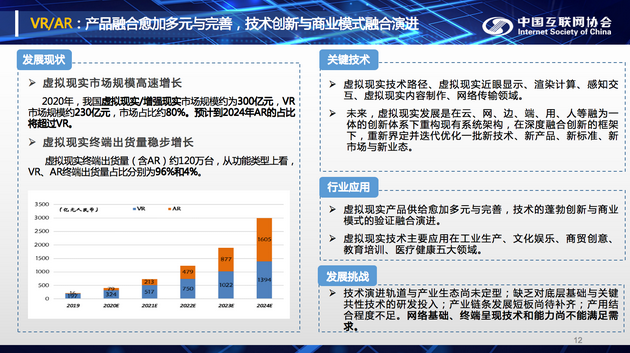 報告顯示,我國虛擬現(xiàn)實市場規(guī)模高速增長。2020年,我國虛擬現(xiàn)實/增強現(xiàn)實市場規(guī)模約為300億元,VR市場規(guī)模約230億元,市場占比約80%。預(yù)計到2024年AR的占比將超過VR。虛擬現(xiàn)實終端出貨量穩(wěn)步增長,虛擬現(xiàn)實終端出貨量(含AR)約120萬臺,從功能類型上看,VR、AR終端出貨量占比分別為96%和4%。