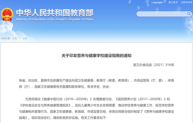 教育部網(wǎng)站今年6月24日發(fā)文《教育部聯(lián)合國家衛(wèi)生健康委等四部門印發(fā)營養(yǎng)與健康學(xué)校建設(shè)指南》,對適應(yīng)兒童青少年生長發(fā)育需要,推動學(xué)校營養(yǎng)與健康工作,規(guī)范學(xué)校營養(yǎng)與健康相關(guān)管理行為作出要求。
