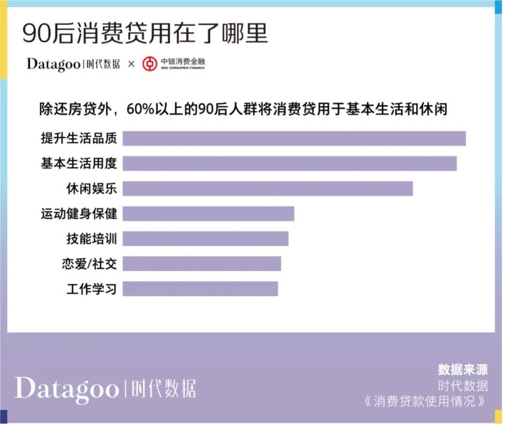 報(bào)告認(rèn)為,除了消費(fèi)方式上的差異,在最基本的生活需求滿足后,90后也有著與上一輩截然不同的消費(fèi)觀念。在他們看來,消費(fèi)是為了更好的體驗(yàn),追求更有品質(zhì)感的生活。他們愿意在自己喜愛的領(lǐng)域投入更多的資金。而互聯(lián)網(wǎng)金融產(chǎn)品的誕生與繁榮讓年輕人的消費(fèi)少了很多約束。除還房貸外,60%以上的90后將消費(fèi)貸用于提高生活品質(zhì)和休閑。