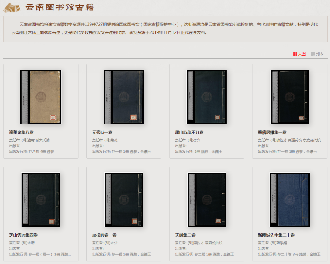 云南省圖書館將該館古籍?dāng)?shù)字資源共 139 種 727 冊提供給國家圖書館(國家古籍保護(hù)中心),這批資源均是云南省圖書館所藏珍貴的、有代表性的古籍文獻(xiàn),特別是明代云南麗江木氏土司家族著述,更是明代少數(shù)民族漢文著述的代表。該批資源于 2019 年 11 月 12 日正式在線發(fā)布。