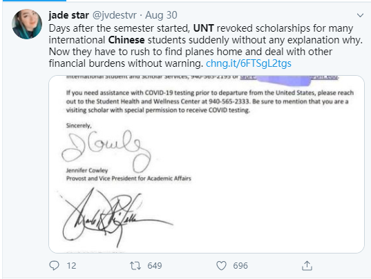 在美國請愿類信息網(wǎng)站“Change.org”上,一則為北得克薩斯州大學(xué)的中國留學(xué)生求助的網(wǎng)貼就表示,該校是在8月26日當(dāng)天突然宣布中止受中國國家留學(xué)基金委員會資助的訪問學(xué)生和學(xué)者的學(xué)習(xí)資格的,并要求這些持有J-1類簽證的中國公派留學(xué)生和學(xué)者在1個月內(nèi)離境。可該校至今也沒有透露這么做的原因是什么。