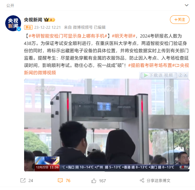明天(12月23日),2024年全國碩士研究生招生考試將正式開考。據(jù)央視新聞,今年多個省份在考研須知中明確表示,考生入場時將新增智能安全門檢 ...