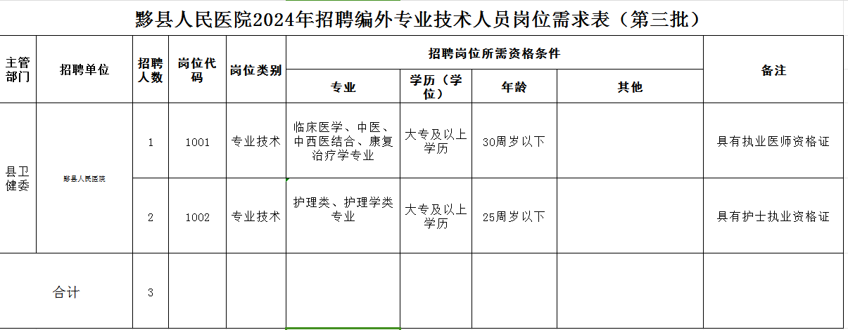 附:黟縣人民醫(yī)院2024年招聘編外專業(yè)技術(shù)人員崗位需求表(第三批)