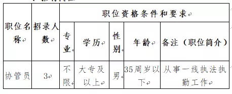 3、協(xié)管員具有符合職位要求的文化程度與工作能力,退伍軍人可放寬至高中畢業(yè)學歷,年齡可放寬至40周歲(1979年11月23日至2002年11月23日期間出生)。