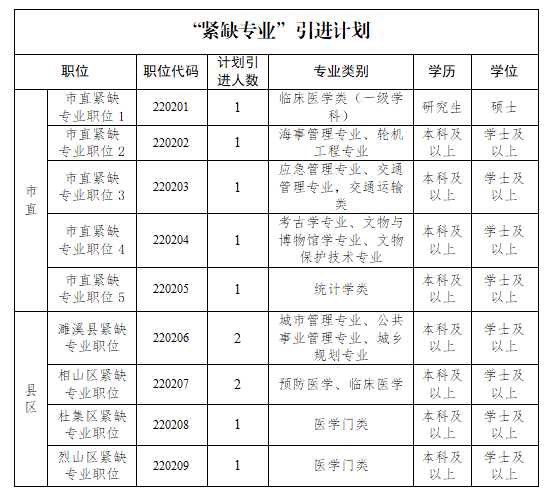 采取“大學科”+“緊缺專業(yè)”形式,市縣(區(qū))“大學科”計劃引進博士人數(shù)不限、文史類23名、理工類37名,“緊缺專業(yè)”計劃引進11名(崗位如下):