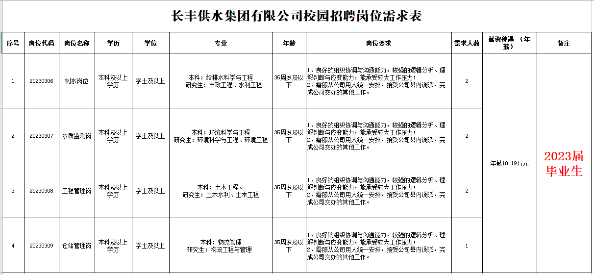 長豐供水集團(tuán)有限公司系長豐縣屬國有企業(yè)。注冊資金3個億,市值18億。集團(tuán)公司下轄14個鄉(xiāng)鎮(zhèn)供水所、3個制水廠、4個子公司。因工作需要,合肥慧豐人才服務(wù)有限公司受長豐供水集團(tuán)有限公司委托,現(xiàn)面向校園招聘工作人員7名,現(xiàn)將有關(guān)事項公告如下: